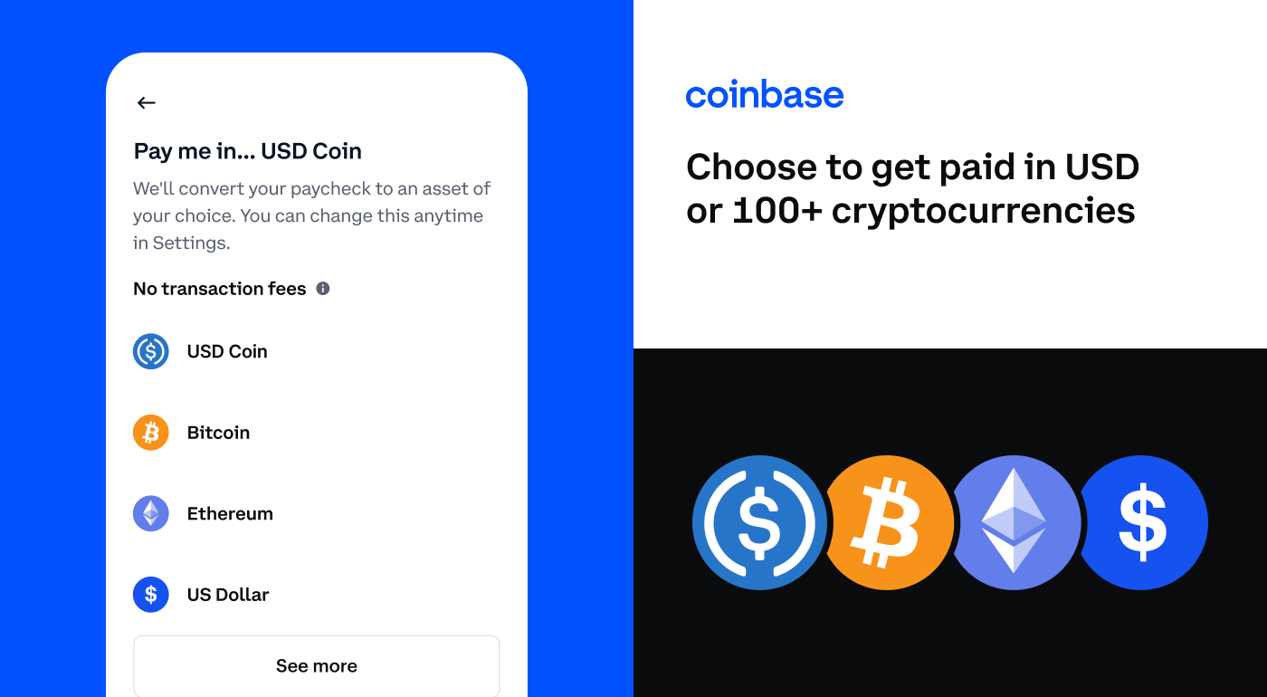 ³ If you choose to be paid in crypto, Coinbase will automatically convert your paycheck from US dollars to crypto with no transaction fees. See terms.