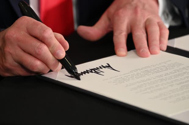US President Donald Trump signs executive orders extending coronavirus economic relief, during a news conference in Bedminster, New Jersey, on August 8, 2020.