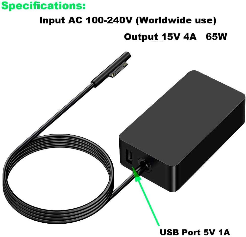 Input: 100-240V 50 / 60 Hz; Output:15V-4A 65W; USB Port: 5V-1A; replacement for Microsoft surface pro charger, a good replacement ac adapter if your original power supply has run out of life.